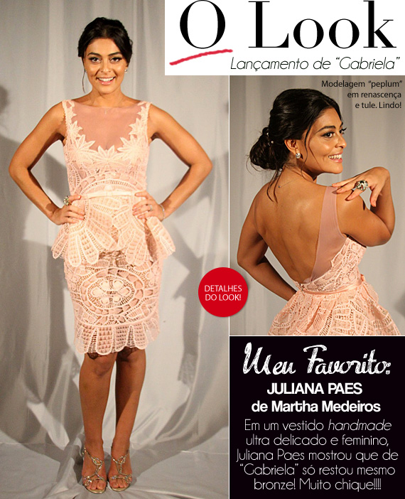 Totalmente diferente da caracterização que tá todo mundo curioso pra ver na novela, Juliana escolheu um vestido ultra delicado e feminino, todo em renda renascença e detalhe de transparência em tule – achei o handmade uma ótima escolha, remeteu ao Nordeste de maneira nada óbvia e super chique! A modelagem de saia lápis + peplum ficou um charme e o tom nude rosé só ressaltou o bronze,